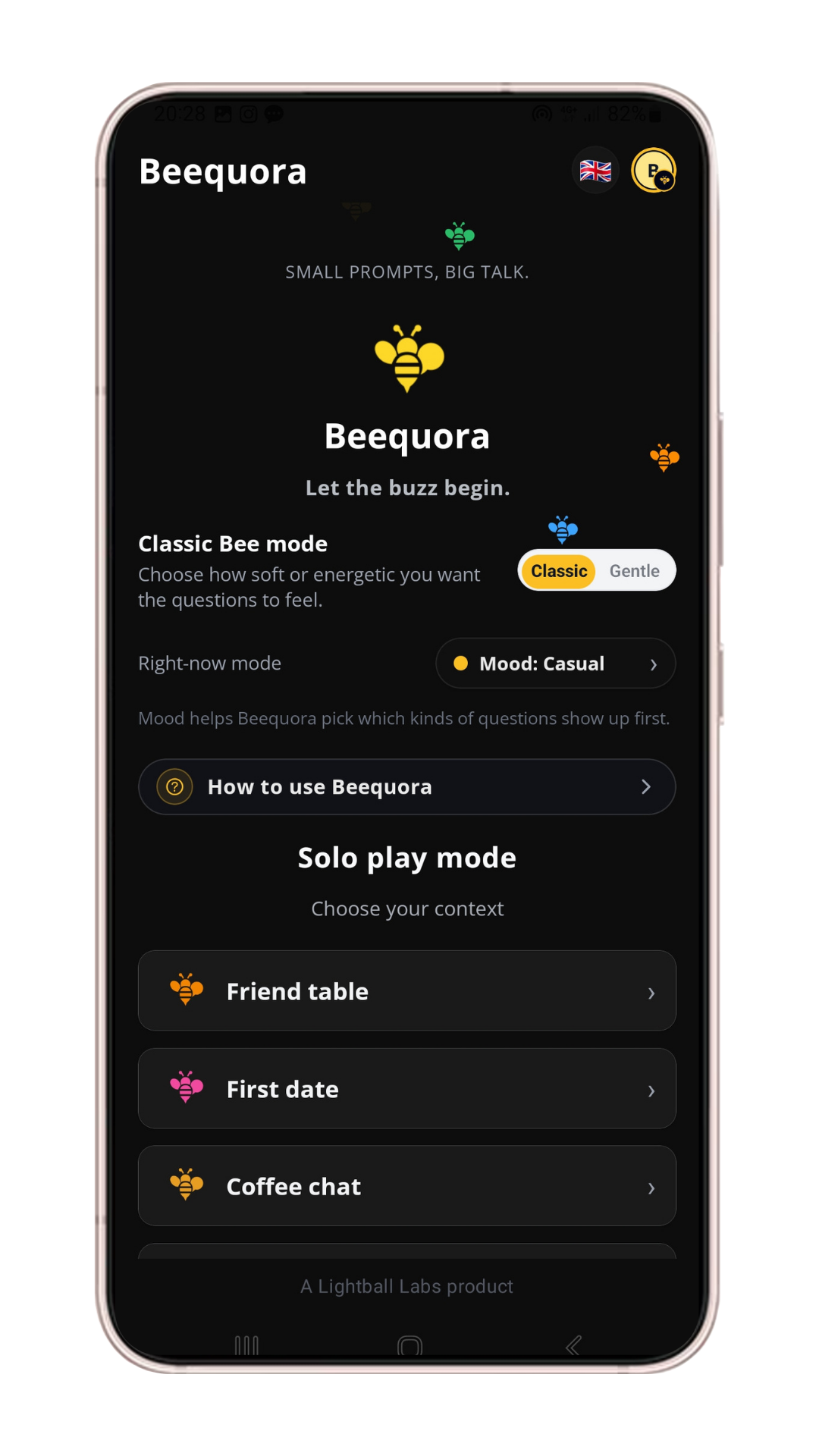 Friends, family, first dates, work — Beequora adapts the questions to the moment.